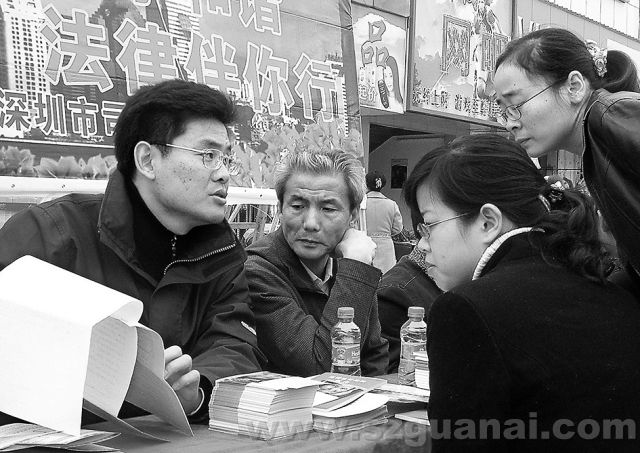 2007年2月22日,由市司法局組織的“將石社區關愛勞務工法律援助送溫暖”活動在華安商業城廣場面場拉開帷幕。市法律援助處、市普法辦、市公證處等部門的22名法律工作者,現場為外來勞務工提供法律咨詢、法律援助服務,截至下午四時,共接受現場咨詢534人次,現場接受法律援助申請75宗,派發法律書籍和資料20000份,近萬名外來勞務工參與了活動。(通訊員 楊涌 晶報記者 溫文鋒 攝影報道)