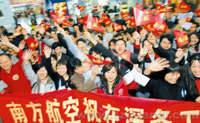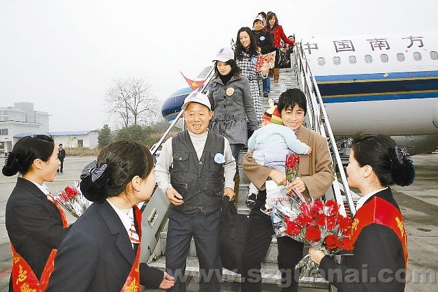 2007年2月9日11點多,安心航班平安降落在長沙黃花機場。湘籍勞務工走下飛機受到共青團湖南省委等有關部門熱烈歡迎。 (王洪濤攝)