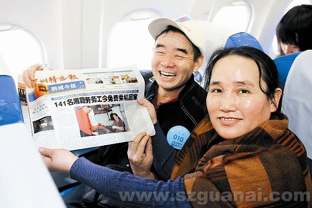 2007年2月9日9點36分,湘籍勞務工俠上愛心航玫,南航空姐為他們熱情服務。(王洪濤攝)