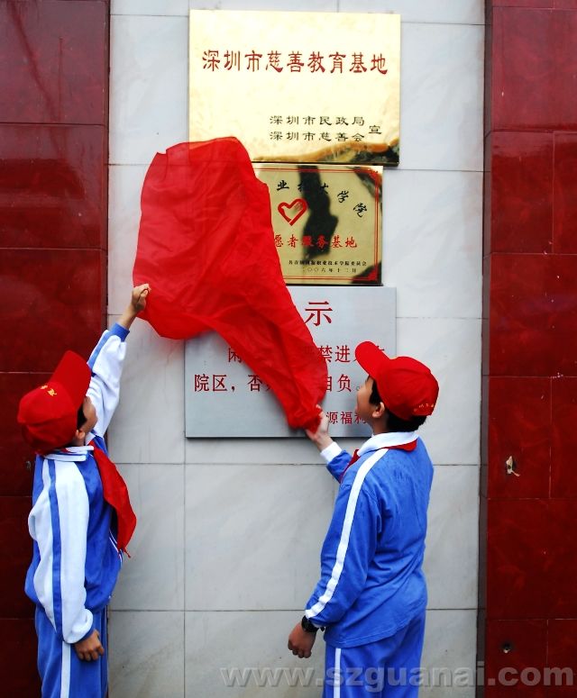 兩名小學生為我市在河源市福利中心設立的“深圳慈善教育基地”揭牌(陳錦輝攝)