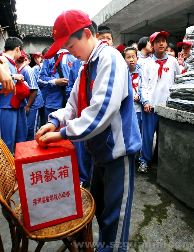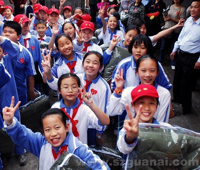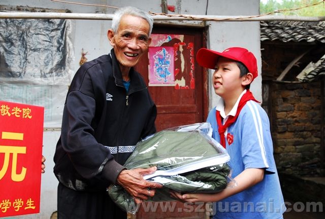 孩子們將深圳人民捐贈的棉被送到老人院里(陳錦輝攝)