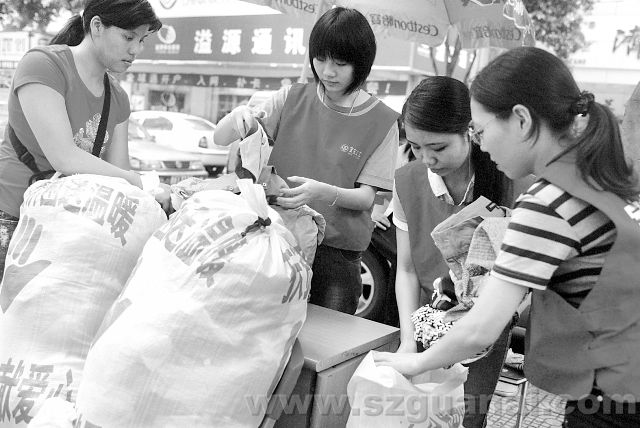 圖片說明:2007年8月5日,寶安區(qū)義工聯(lián)、寶安陽光志愿者服務(wù)隊(duì)開展“關(guān)愛貧困山區(qū),傳遞深圳愛心”活動(dòng),百名義工走上街頭社區(qū)收集舊書舊衣募捐,居民紛紛捐衣捐書,有的居民特意到商場買一些新衣服捐出來,已收集衣服3000多件,上千冊書籍和藥品。這是義工在整理包裝衣服。(特區(qū)報(bào)記者邱海彬通訊員鄧偉超攝)