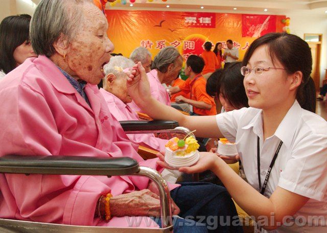 2007年8月,寶安區(qū)義工聯(lián)和深圳愛索佳實(shí)業(yè)有限公司青年員工們,給西鄉(xiāng)敬老院的老人送來禮品、生日蛋糕,并和老人家一起過生日,祝愿他們健康長壽生日快樂,這是該公司舉辦的,“情系夕陽、關(guān)愛老人”為主題的愛心活動(dòng),目的讓更多的青年人孝敬老人關(guān)愛老人.圖為和老家一起跳舞、吃生日旦糕。(特區(qū)報(bào)記者邱海彬攝)