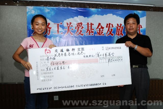 “慈善小天使”左沛鑫(左)為勞務(wù)工家屬發(fā)放關(guān)愛(ài)基金