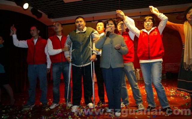 2006年12月26日,南山區義工聯在南海小學舉行迎新年聯歡晚會,200多名義工歡聚一堂,有各種表演、游戲,對義工聯的工作進行回顧和展望。圖1:受到義工關愛資助而康復情況良好的殘疾人王亮(拄著拐杖)與母親(拿話筒)、義工合唱“愛的奉獻”。圖2:受到義工關愛資助的殘疾人張恒山與義工合唱“我想有個家”。 特區報記者 (特區報程海昆 攝影報導)