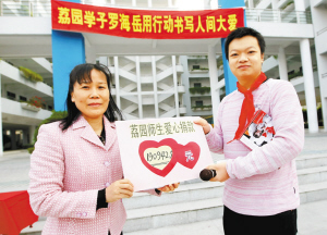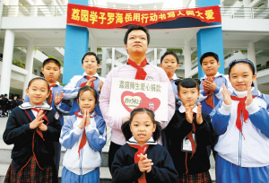 張曉:其實羅海岳也是一種現象,可以影響很多小孩和家庭來共同實施公益事業。最近就有一個離休老干部打來電話要找海岳,說他積攢了一筆錢,想去幫助失學兒童。前幾天還有個市民給我發來郵件也想參與到愛心行動中去,我問他是從事什么工作的,他說他剛剛失去工作,我吃驚他失業了還想著去幫助別人,他說工作還會有的,但是海岳說了幫人的事情不能等。這就是影響和輻射的力量。今天我和海岳去了他的母校荔園小學,短短幾小時就收到十幾萬捐款,我覺得海岳從事的工作就是在播撒著一顆顆愛心的種子。