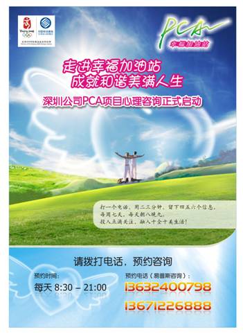 自2008年9月8日起,公司為全體同事提供的一項(xiàng)全新的福利項(xiàng)目——“PCA心理咨詢”就正式為您提供服務(wù)啦!