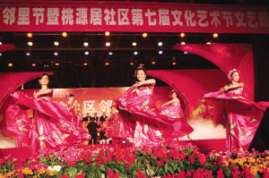 當(dāng)晚7時(shí)30分,在一陣歡快明亮的民樂(lè)演奏《喜洋洋》樂(lè)曲聲中,“鄰里一家親、生活樂(lè)繽紛”深圳市第三屆“社區(qū)鄰里節(jié)”暨第七屆桃源居社區(qū)文化藝術(shù)節(jié)綜藝晚會(huì)在桃源居社區(qū)大家樂(lè)舞臺(tái)拉開(kāi)帷幕。整臺(tái)晚會(huì)分為鄰里親情、繽紛生活兩個(gè)樂(lè)章,16個(gè)節(jié)目緊緊圍繞本屆“社區(qū)鄰里節(jié)”主題,情景劇《家和萬(wàn)事興》再現(xiàn)了社區(qū)居民生活原型,老年大學(xué)學(xué)員排的《軍中姐妹》表現(xiàn)出來(lái)的氣質(zhì)讓現(xiàn)場(chǎng)所有觀眾為之一亮,肚皮舞《歡樂(lè)的春天》詼諧愉悅,讓所有居民都參與進(jìn)來(lái),相互增進(jìn)友誼,社區(qū)就是一個(gè)大家庭是它的主題。