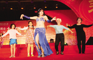 社區老人和小孩一起走上舞臺和肚皮舞老師跳肚皮舞。