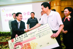 昨日深圳迅寶公司董事長劉關清將50萬元人民幣交到深圳關愛行動組委會辦公室主任、深圳報業集團社長黃揚略手中,用于幫助隴南災區學校建“媽媽食堂”。本報記者 施平 攝