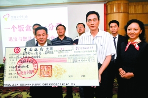 由市關愛辦發起的向甘肅隴南災區捐建“媽媽食堂”愛心助學活動在深圳引起熱烈反響,昨天上午,深圳迅寶環保股份有限公司董事長劉關清向市關愛辦主任、深圳報業集團社長黃揚略遞交了捐建“媽媽食堂”首期啟動資金50萬元支票。在捐贈儀式上,黃揚略表示,深圳的發展離不開全國人民的支持,迅寶公司的義舉是深圳回報全國人民的一個生動體現。至今,由市委、市政府倡導發起的深圳關愛行動已成功開展六屆,吸引了成千上萬廣大市民的熱情參與,成為深圳提升城市人文精神、開展文明城市創建的一張亮麗名片,希望更多的愛心企業和企業家參與到這個活動中來。