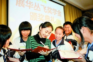 邢丹為展華實(shí)驗(yàn)學(xué)校的學(xué)生頒發(fā)叢飛獎(jiǎng)學(xué)金。