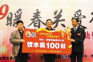深圳報業(yè)集團黨組成員、副總編輯、晶報總編輯陳寅(中)向舟曲縣教育局書記(左一)和舟曲縣一中校長轉(zhuǎn)贈晶報讀者捐贈的100臺飲水機。