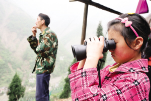 8位親人在地震中遇難的郝絲宇用望遠鏡遙望家鄉。