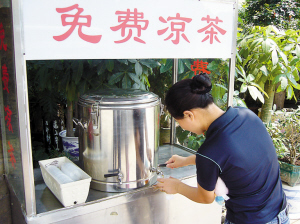 ?????近來天氣炎熱,寶安區新安汽車站附近的一家花店免費向過往市民提供涼茶,受到市民的贊許。(記者 楊明銘)