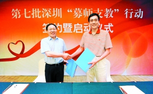 (本網(wǎng)訊) 6月23日,第七批深圳“募師支教”行動(dòng)簽約暨啟動(dòng)儀式在深舉行,深圳市關(guān)愛(ài)辦主任、深圳報(bào)業(yè)集團(tuán)黨組書記、社長(zhǎng)黃揚(yáng)略代表主辦方,與贊助方深圳中航集團(tuán)股份有限公司董事長(zhǎng)吳光權(quán)正式簽署《深圳市第七批“募師支教”公益合作協(xié)議書》,標(biāo)志著深圳關(guān)愛(ài)行動(dòng)品牌項(xiàng)目——“募師支教”再次啟動(dòng)。由深圳中航集團(tuán)出資100萬(wàn)元人民幣、獨(dú)家贊助的第七批“募師支教”行動(dòng),從即日起面向全國(guó)公開(kāi)招募80名支教志愿者,他們將分赴甘肅隴南、江西井岡山和廣西等地的山區(qū)學(xué)校,支教一個(gè)學(xué)期。深圳報(bào)業(yè)集團(tuán)副總編、深圳商報(bào)副總編李南玲主持了“募師支教”行動(dòng)簽約儀式。