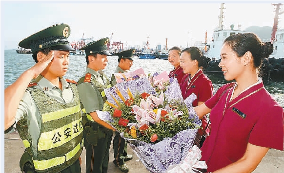 昨日(29日),南航深圳公司客艙一分部木棉組空姐來到深圳經濟特區蛇口特檢站,向部隊官兵致以節日的問候,并獻上鮮花,慶祝八一建軍節的到來。(記者 王洪濤 通訊員 楊華 王穎楊錦茹 攝)
