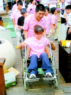 ?。ū揪W訊)在西鄉大辰金電子公司里,員工全是殘疾人,他們有的腿殘疾不能行走,只能坐輪椅拄拐杖,有的上身殘疾或身體矮小,但他們在生活和工作中互相照顧,能走的同事就熱情推著坐在輪椅上的同事上下班。大家十分快樂和諧。(景 生 攝)