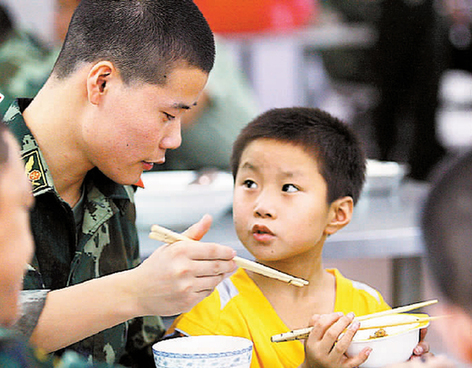▲ 戰(zhàn)士陪走失孩子一起吃飯,想盡了各種辦法,就是沒法問出他家究竟在哪里。 本報(bào)記者 薛云麾 攝