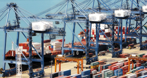 工作人員指揮裝滿活動(dòng)板房的貨柜裝船。