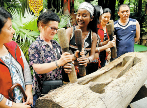 昨天是第26個國際盲人節,錦繡中華·民俗村邀請60名盲人與60名義工到景區感受華夏風光,觸摸民俗風情。這是盲人朋友在佤族演員陪同下共擊佤族傳統樂器“木鼓”。