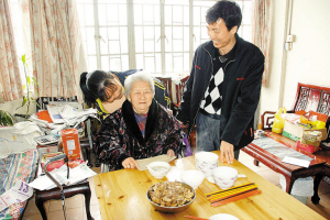 曾雪梅跟老人講悄悄話,老人很開心。