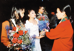 在2000年的一個表彰儀式上,成功移植眼角膜的患者給角膜捐獻者的家人獻上鮮花表達感謝。當年深圳眼庫共接受了10例眼角膜捐獻。 深圳特區報記者許光明 攝