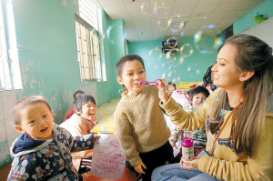 明媚春光,快樂童心。2010年1月12日,在深圳市社會福利中心201室里,18歲的美國姑娘蕾絲和孩子們一起吹泡泡。
