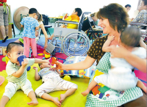 不久前的一個暖和下午,來自美國的邰敏(音譯)女士和她的18歲女兒蕾絲(音譯),在深圳市社會福利中心201室里,和生活在這里的孤兒、殘疾兒童一道玩耍,還熱心地教他們畫畫,忙碌著給他們喂飯、喂奶,就像照顧自己的孩子一樣……