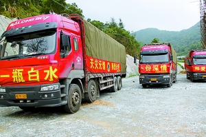 裝滿礦泉水的大卡車啟程去廣西。記者 賈少強 攝
