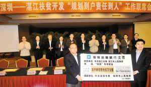 (本網訊)28日,在深圳—湛江扶貧開發“規劃到戶責任到人”工作聯席會議上,率隊前往湛江考察的省委常委、市委書記、代市長王榮代表深圳向湛江捐贈“雙到”資金9415萬元。王榮肯定“雙到”工作開局很好,取得了初步成效,同時要求深圳各掛點幫扶單位穩步推進,注重實效,確保3年內我市掛扶湛江的100個貧困村基本改變落后面貌,掛扶5萬多戶貧困群眾基本實現穩定脫貧。