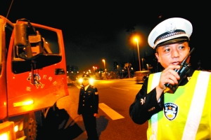 夜深了,交警還在路上執勤。記者 薛云麾 攝