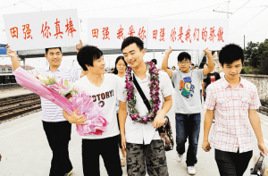 日前,湖北省孝感學院大二學生田強收到骨髓庫的通知,他的造血干細胞的采集樣本和上海一名12歲的白血病患者配型成功。為挽救病人生命,他放棄了學校的期末考試,在7月4日到達北京捐獻骨髓。7月11日,在北京捐獻完骨髓的田強返回學校,受到大家的熱烈歡迎。