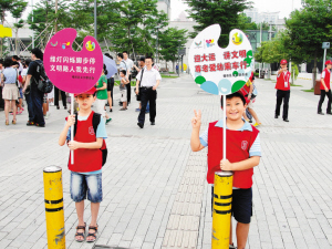 ??? 在深圳中心書城,有很多小孩子做義工提醒行人遵守交通規(guī)則。小朋友們?cè)谟眯袆?dòng)告訴大家什么是文明,“大朋友”也要注意啦!