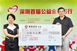 深圳特區報總編輯陳寅(右)代表“公益金百萬行”主辦方從陳國紅(左)手中接過十萬元支票。深圳特區報見習記者 何龍 攝