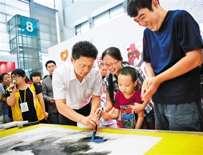 ????昨日,國際藝術(shù)大師、原美國亞洲文化藝術(shù)基金會副主席邢東現(xiàn)身慈展會,與深圳自閉癥患者貝貝共畫荷花。 深圳商報記者 施平 攝