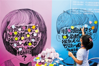 ????昨日,在慈展會上,一位小朋友在一家罕見病關(guān)愛中心愛心板上留言。 深圳商報記者 肖兵峰 攝