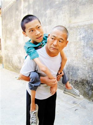 ????現今,王中民每每從工廠做完清潔回來,不管多晚,都會背著兒子出門,他背的姿勢也很獨特,兒子的兩只瘦腳被他夾在腋下,兩手抓著兒子的兩手?!拔冶沉晳T了,一點都不覺得他重。”