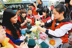昨日,龍崗中專的學生來到龍崗世貿U站,與義工和市民一起制作簡易插花、DIY賀卡,豐富U站志愿服務形式,拓展U站服務領域,并為在U站服務的義工贈送插花和新春賀卡,學習義工們的奉獻精神。