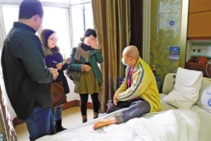 病房里的梁志友剛剛輸完液,臉上戴著口罩,身體看起來很虛弱,但是見人來看望,卻表現(xiàn)得很熱情。婷婷剛到病房,就和他聊起天來,一邊打開袋子里的兩套衣服,那是她利用周末閑暇去買的。梁志友有兩個(gè)女兒,分別是3歲、7歲,婷婷根據(jù)自己的判斷,就買了兩套棉衣。“你還有孩子,要堅(jiān)強(qiáng)。”婷婷在病床前鼓勵(lì)梁志友。