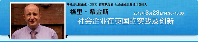 ????2013年3月28日14:30-16:00,深圳市關愛辦與英國總領事館文化教育處特邀蘇格蘭社區企業(CEiS)首席執行官、社會企業世界論壇(Social Enterprise World Forum)創始人格里·希金斯先生來到深圳,介紹目前社會企業在英國的現狀、以及如何推動社會企業在國際上的發展。