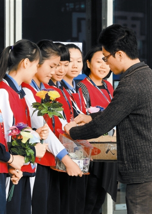 日前,深圳市第三職業技術學校學生在深圳會展中心現場義賣義工制作的玫瑰花,為深圳市志愿服務基金會募集善款,用于資助貧困山區孩子等服務項目。