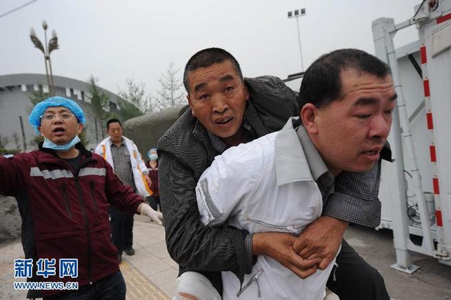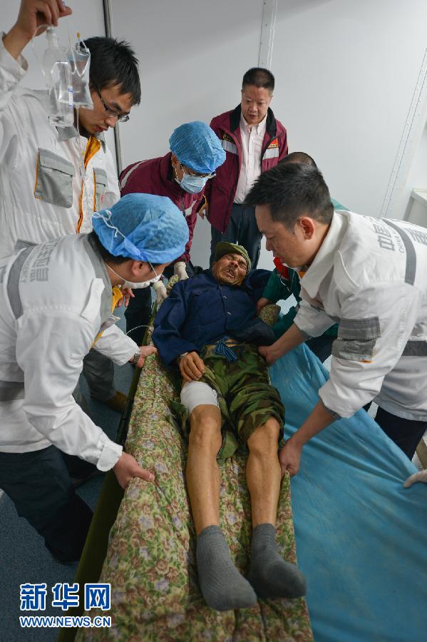 4月21日,重慶緊急醫(yī)學(xué)救援隊(duì)在救治從寶興縣靈關(guān)鎮(zhèn)轉(zhuǎn)移的重傷員楊秀全。來自民政部的消息,據(jù)四川省民政廳21日17時(shí)統(tǒng)計(jì),四川蘆山7級(jí)地震已造成208人死亡、失蹤,其中184人死亡、24人失蹤,另有11826人受傷。新華社記者李健 攝