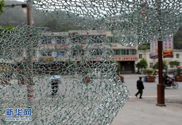 4月21日在四川省雅安市寶興縣靈關(guān)鎮(zhèn)拍攝的在地震中受損的玻璃。來自民政部的消息,據(jù)四川省民政廳21日17時(shí)統(tǒng)計(jì),四川蘆山7級(jí)地震已造成208人死亡、失蹤,其中184人死亡、24人失蹤,另有11826人受傷。新華社發(fā)(薛玉斌攝)