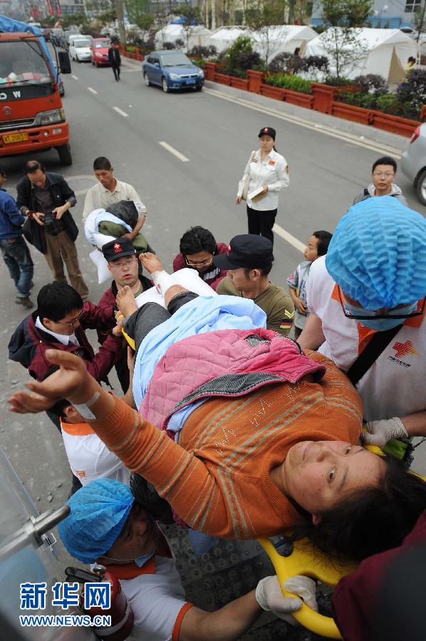 4月21日,重慶緊急醫(yī)學(xué)救援隊(duì)在救治從寶興縣靈關(guān)鎮(zhèn)轉(zhuǎn)移的重傷員楊孝麗。來自民政部的消息,據(jù)四川省民政廳21日17時(shí)統(tǒng)計(jì),四川蘆山7級(jí)地震已造成208人死亡、失蹤,其中184人死亡、24人失蹤,另有11826人受傷。新華社記者李健 攝