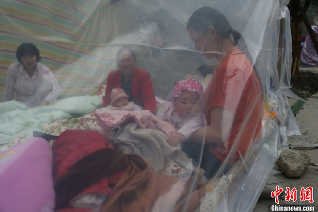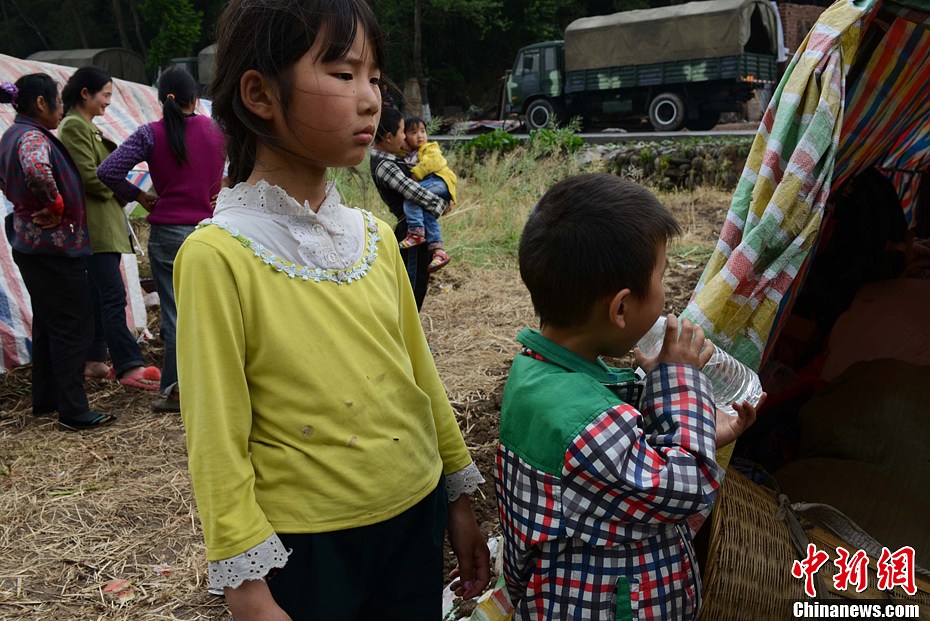 4月21日,四川省雅安市寶興縣靈關災民安置點的老婦和孩童。中新社發廖攀 攝