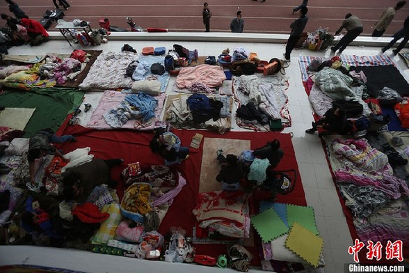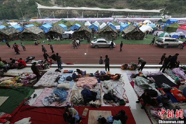 寶興縣中學操場成為寶興縣最大的災民安置點,災民們在操場看臺等地暫時安家。許云峰 攝