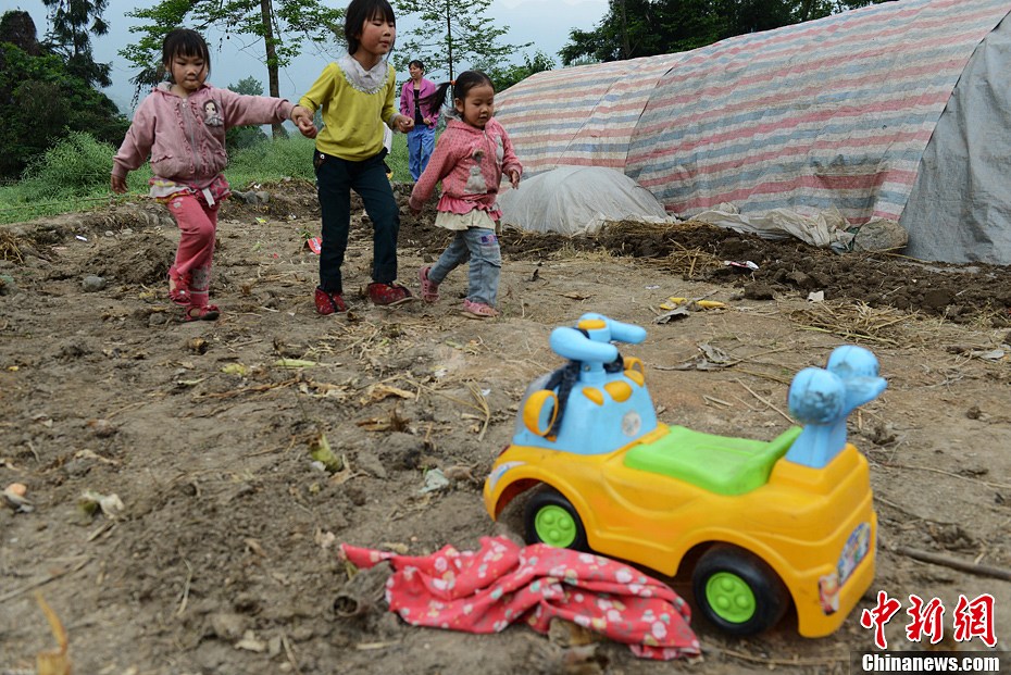 4月21日,四川雅安蘆山縣龍門鄉三個小孩在一輛玩具車前走過。中新社發 張元 攝
