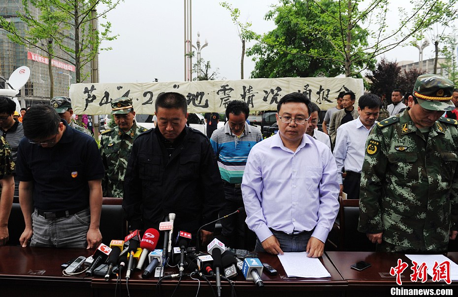 4月21日下午,四川雅安市在蘆山震災區召開抗震救災通報會,通報會上集體向“4.20”地震遇難同胞默哀,期間還兩次發生余震。截至21日地震已導致當地168人遇難,24人失蹤,10871人受傷。已發生余震1606次,最大余震5.4級。圖為雅安市政府副市長廖磊通報震情。中新社發劉忠俊 攝