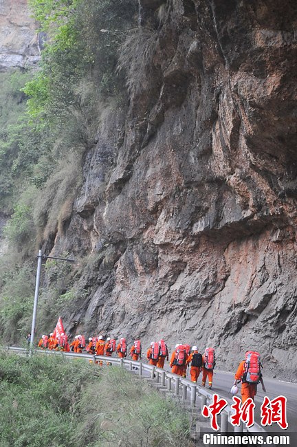 4月20日,南充消防22人救援先鋒隊,每人攜帶30斤的必備裝備器材,路徑峽口頭、靈關中壩等地,徒步行進達50余公里安全挺進寶興展開抗震救災工作。中新社發南充消防 攝